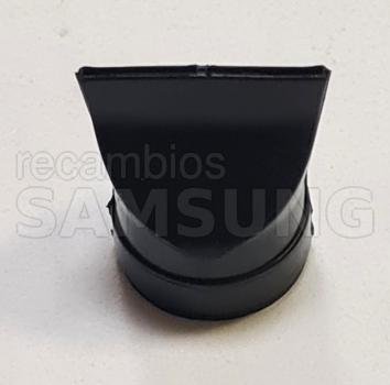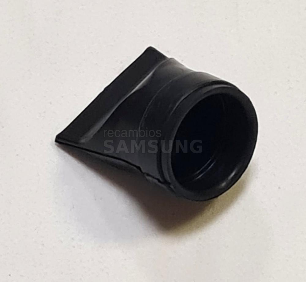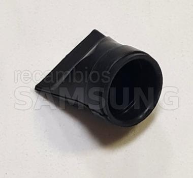 Ojal de drenaje original para frigoríficos Samsung, diseñado para guiar y asegurar la manguera de desagüe en la zona de evacuación de agua. Es una pieza plástica pequeña de color negro, con forma ovalada, que incorpora un orificio central para el paso del agua y un pequeño tetón o tope en uno de sus extremos para fijación y correcta posición. Su función es mantener estable la manguera de drenaje y favorecer el flujo adecuado del agua de condensación hacia el desagüe interno del frigorífico.