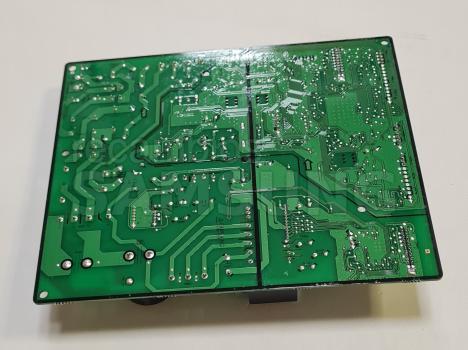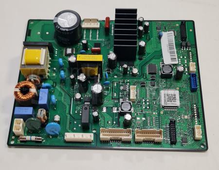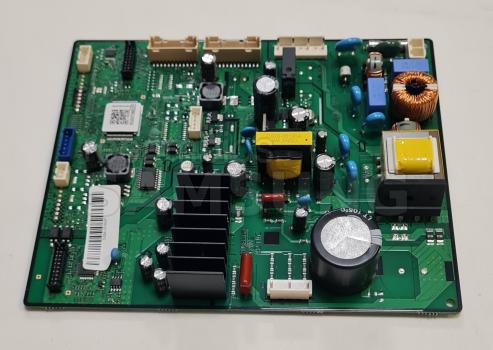 Módulo de control SAMSUNG para frigoríficos, formado por una placa electrónica PCB con memoria EEPROM integrada. Gestiona y coordina las funciones principales del aparato, como la regulación de temperatura y el funcionamiento de los distintos componentes internos. Incluye componentes electrónicos montados en superficie y conectores específicos para su integración en el sistema del frigorífico.