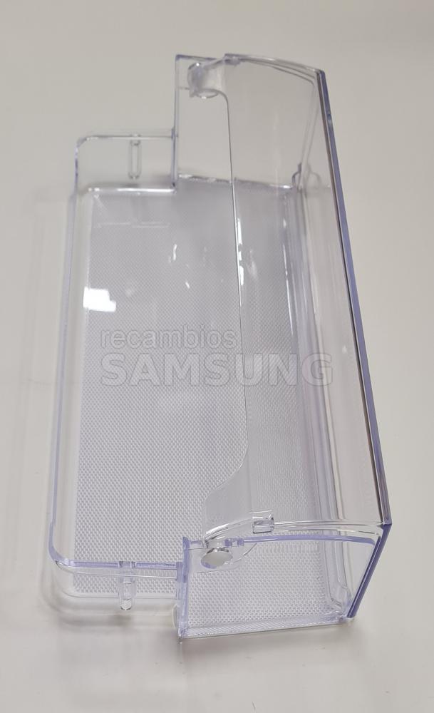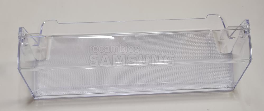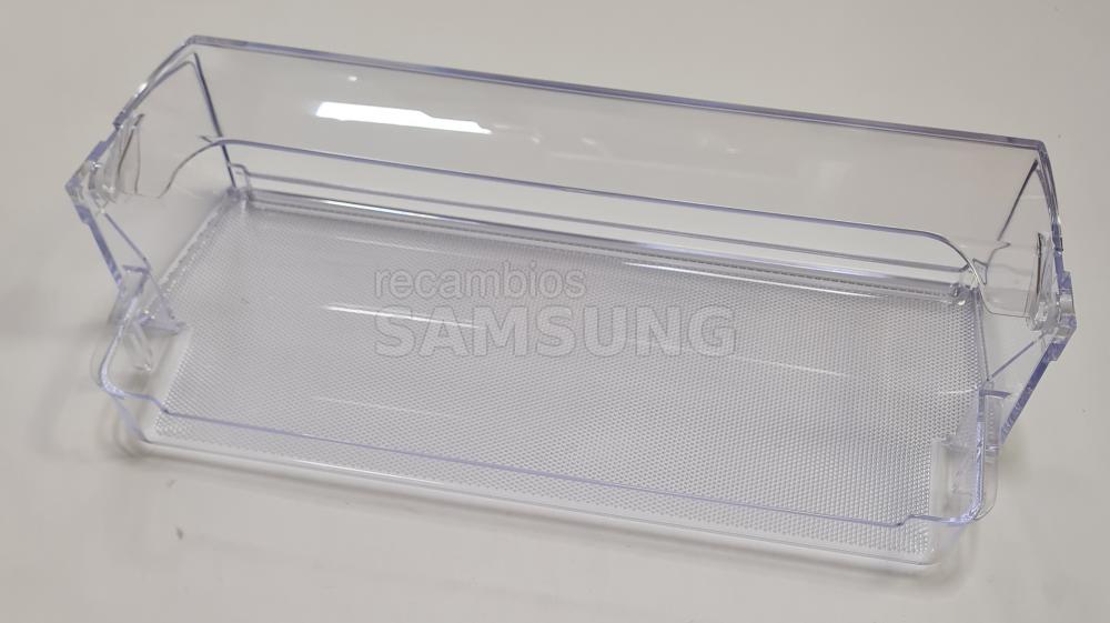 Estante superior para puerta de frigorífico Samsung. Está fabricado en plástico transparente e incorpora una tapa. Repuesto compatible con aparatos de la marca Samsung del tipo frigorífico.