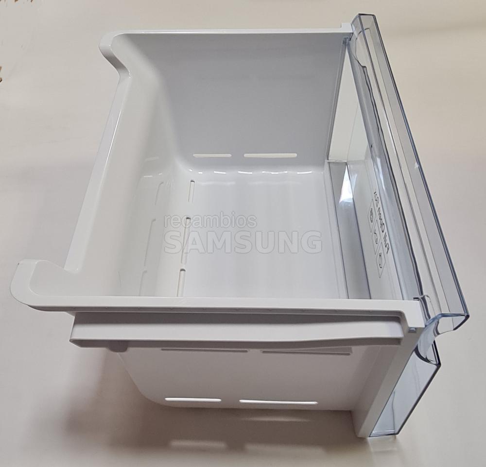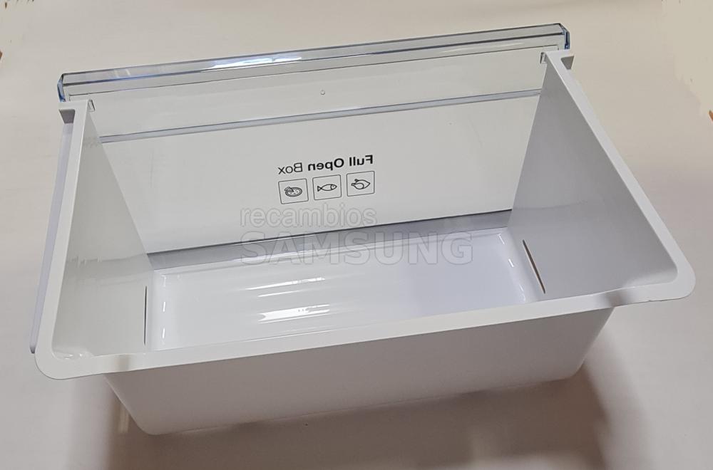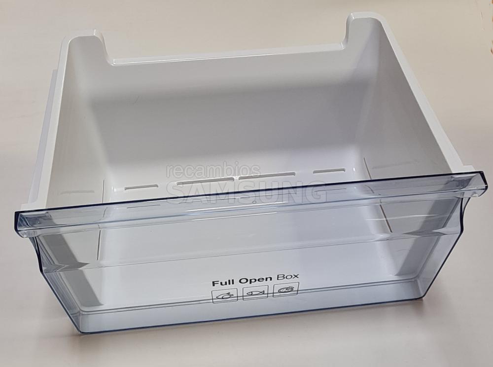 Cajón inferior compatible con frigoríficos Samsung. Corresponde al compartimento para carne y pescado con sistema Full Open Box. Presenta estructura de plástico transparente con zona frontal abatible en acabado gris y transparente. Indicado dentro de la categoría de cajones de congelador.