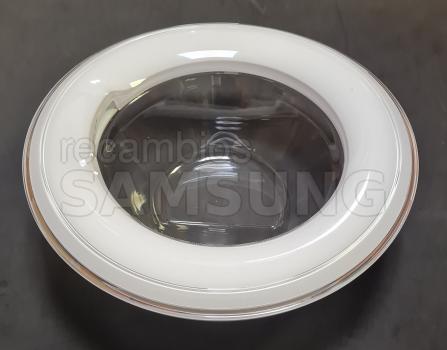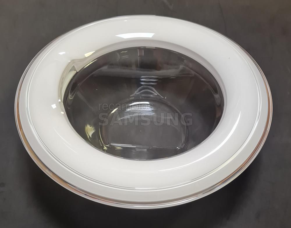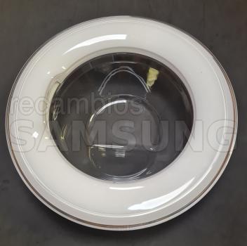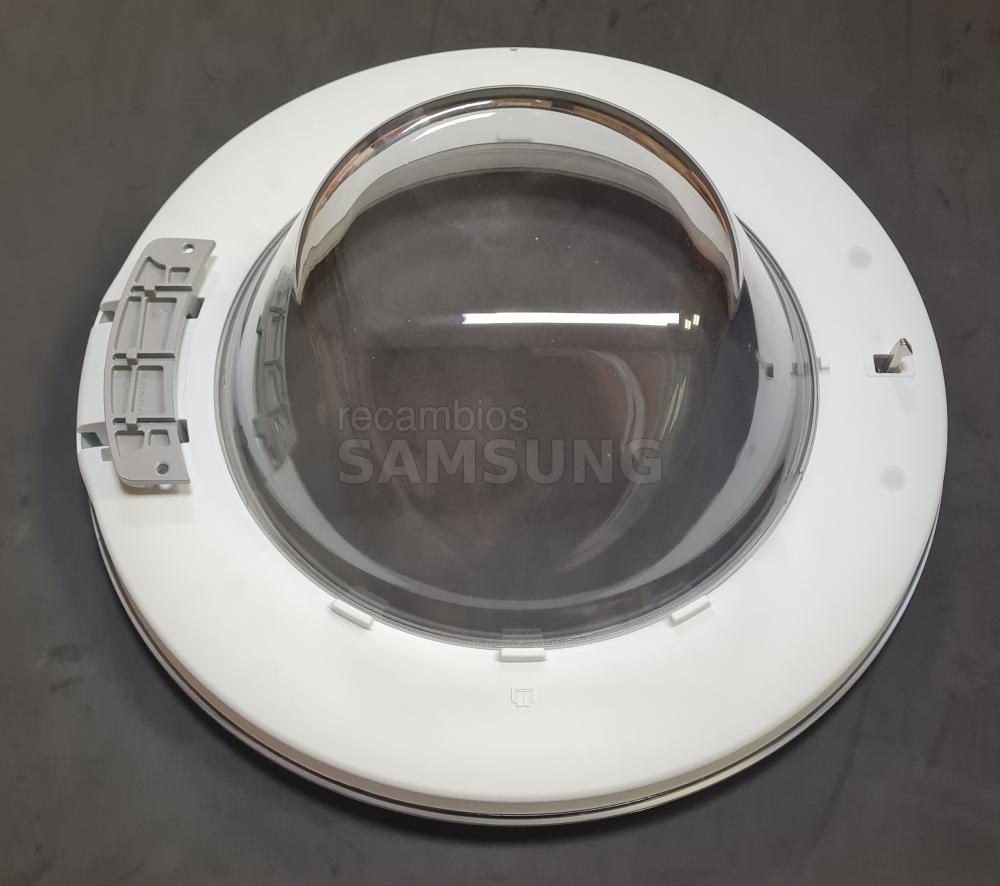 Puerta completa original para lavadora SAMSUNG serie WW5000J. Diseñada para sustituir la puerta frontal de la lavadora, incluye el aro frontal y el conjunto de cristal/ventana integrado. Apta para modelos de carga frontal de la gama WW5000J en color blanco, manteniendo la estética y el encaje original del aparato. Elemento específico para la zona de acceso al tambor, con bisagra lateral compatible con la fijación estándar de la lavadora.
