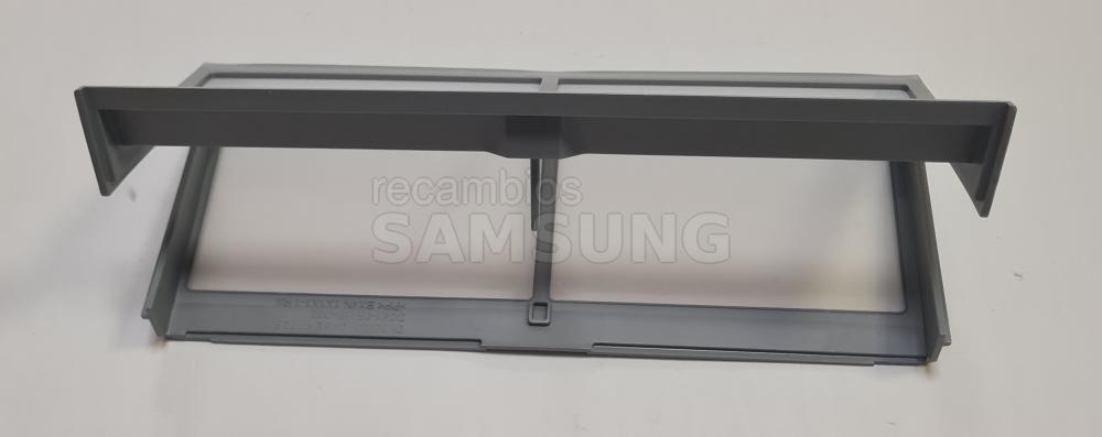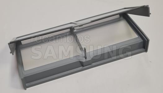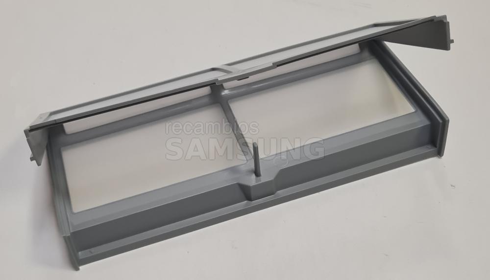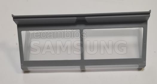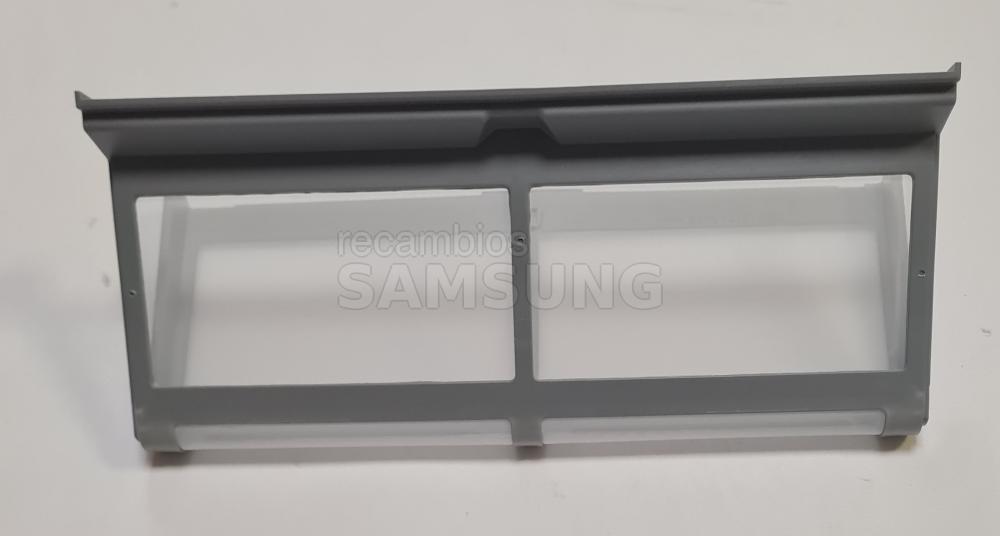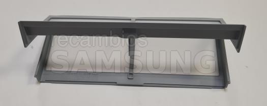 Filtro interior de pelusas compatible con secadoras Samsung. Diseñado para colocarse en el interior del aparato y retener las pelusas generadas durante el secado. Presenta forma rectangular, color gris, marco perforado y asa integrada en la parte superior para facilitar su extracción y colocación. Repuesto correspondiente a la categoría de filtros.